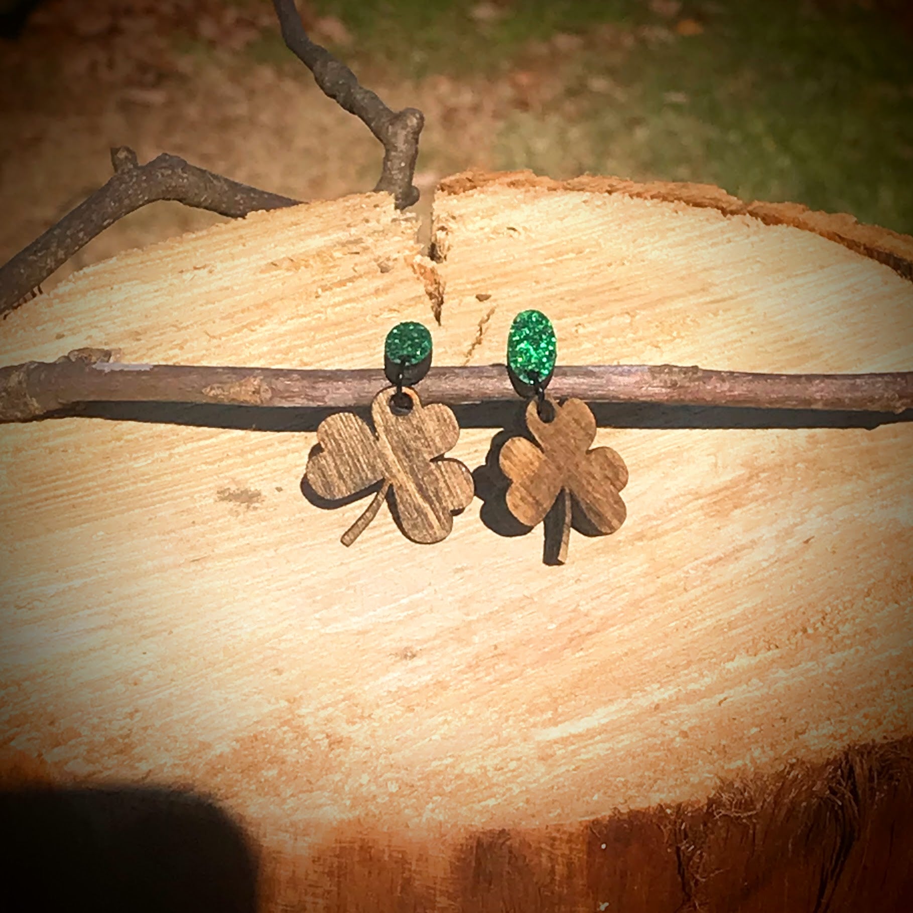Natural Wood Shamrock with Green Glitter Pendant Earrings